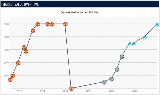 格林伍德离开曼联,在2023年9月租借赫塔费,一年后以2600万欧转会费加盟马赛。凭借出色的表现,格林伍德在赫塔费期间身价上涨到2500万欧,如今在马赛又实现了翻番。