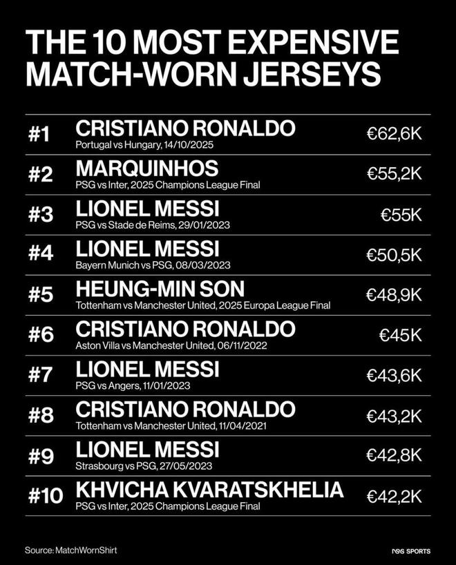 历史最贵实战球衣榜单:C罗一件球衣拍到近513万元 梅西最高451万
